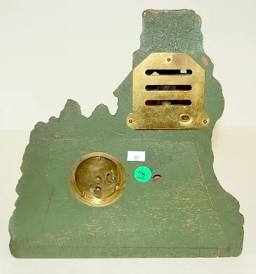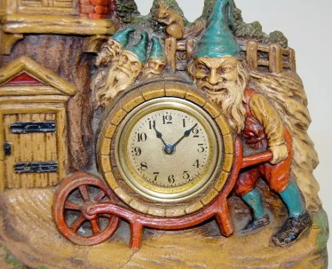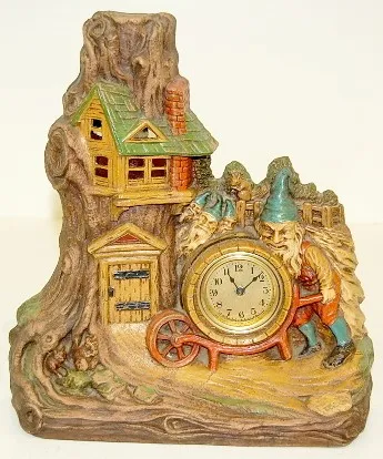 Lux Gnome Tree Wooden Carved Clock Lamp: dial marked; home carved out of a tree with gnomes pushing a wheel barrow towards the door. (Cord has been cu...