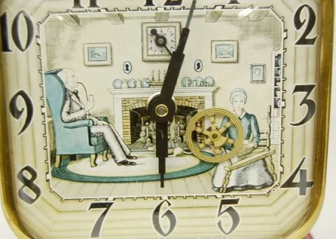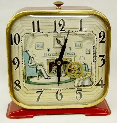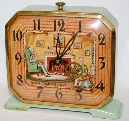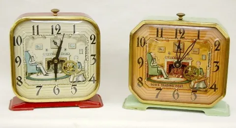 2 Lux Clock Animated Alarm Clocks: 1.) Bob's Trading Post; grandpa in chair, grandma at spinning wheel. 2.) No words, but same scene as above. (Not ru...