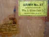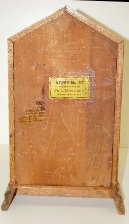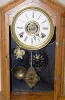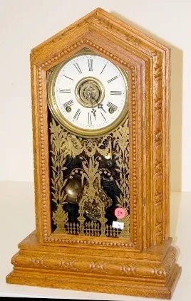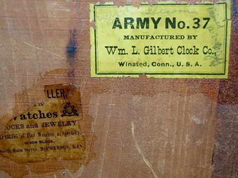 Oak Gilbert Army No.37 Kitchen Clock: time and strike; with alarm; 8 day half hour strike; with pendulum; glass decoration; paper dial with center ala...