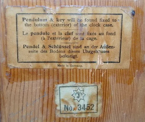 Junghans German 8 Day Clock: time only; painted dial; paper label on back No.3452; decorated glass door. 12 1/2"...