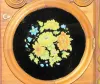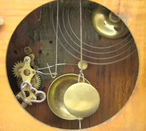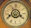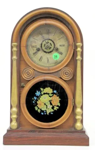 Sessions Round Top Shelf Clock w/Alarm: paper dial; partial label; has pendulum and key; center dial alarm; Pat May 10, 1859 on dial ring; painted flo...