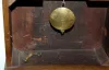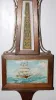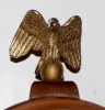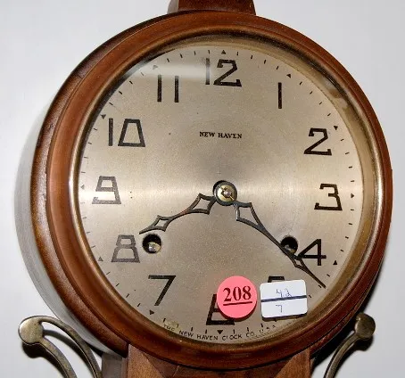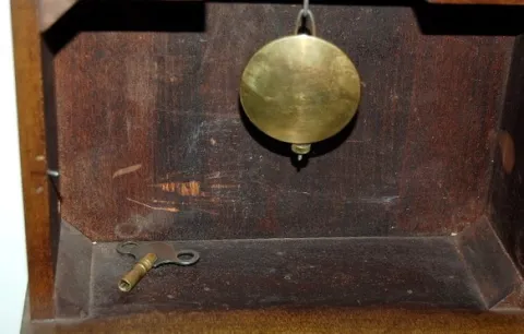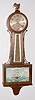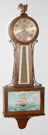 New Haven Whitney Banjo Clock: sailboat glass; metal dial; key and pendulum; time and strike; eagle top. 31"...