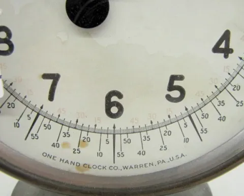 One Hand Clock Co. Warren, PA Clock: paper dial; marked One Hand Clock Co. Warren PA, U.S.A.; thumb wind. (Not running.) 9"...