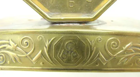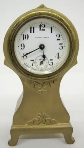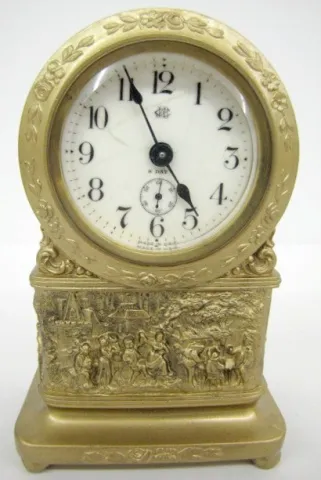 4 Metal Case Dresser Clocks: not tested. 1.) Jennings Bros. with drinking, dancing village scene; marked porcelain dial; 8 day. 2.) New Haven with por...