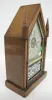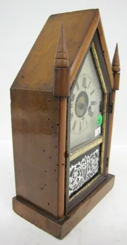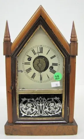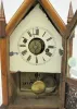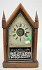Miniature Empire Steeple Clock: time and strike with alarm; metal painted dial; good paper label inside; has pendulum; reverse painted lower door; not...