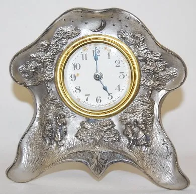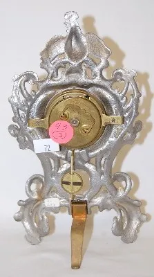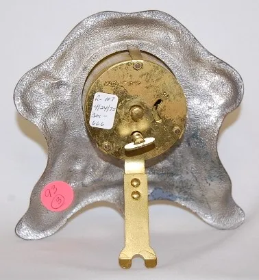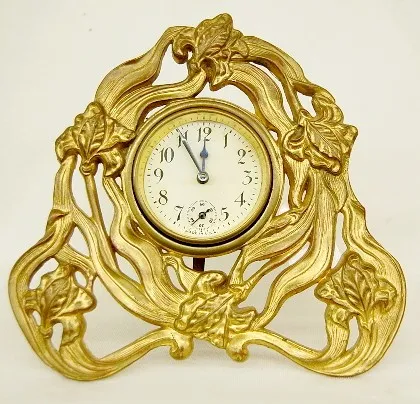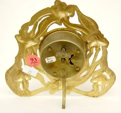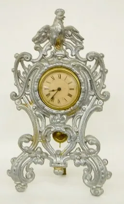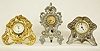3 Metal Novelty Dresser Clocks: 1.) Gold colored metal iris frame; Made in U.S.A.; paper dial. (Not running.) 2.) Silver colored metal frame with roos...