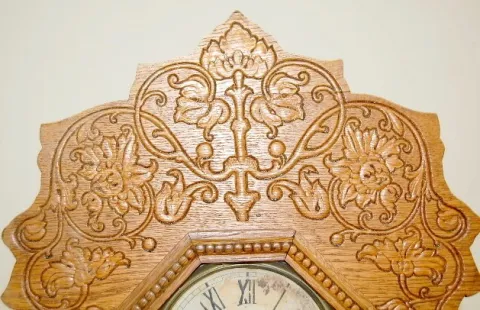 Gilbert Carved Oak T and S Kitchen Clock: (Worn paper dial.)...