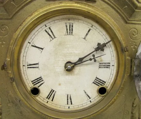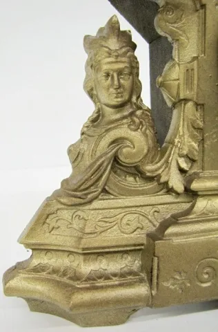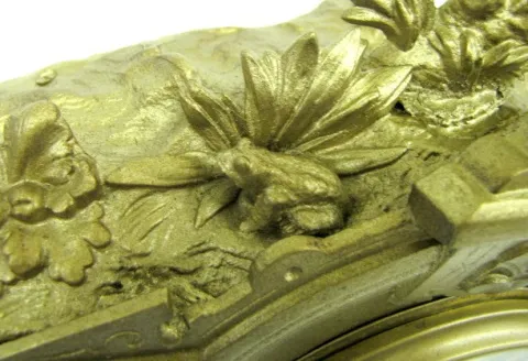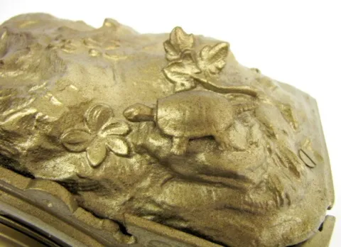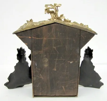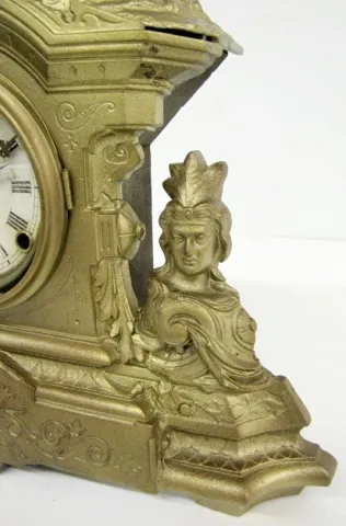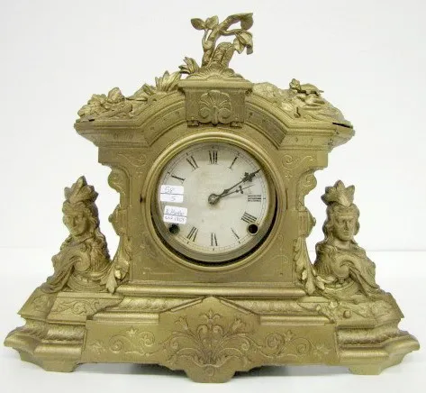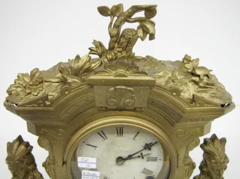 1859 N. Mueller Metal Case Mantle Clock: with lady figures, foliage and small turtle. (Worn paper dial; repainted.)...