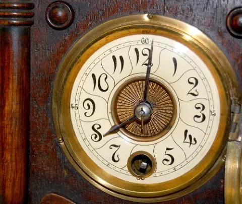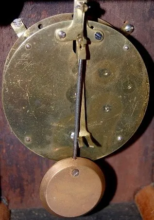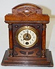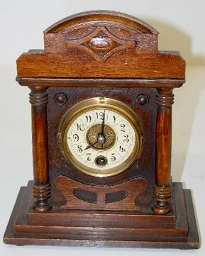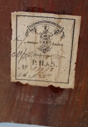 Teutonia Clock Mfg German 8 Day Clock: time only; celluloid dial; paper label inside door Teutonia Clock Mfg. Phillip Hass and Sohne St. Georges; blac...