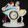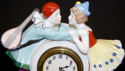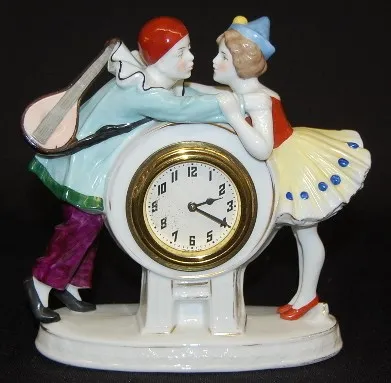 Porcelain Loving Couple Dresser Clock: not marked; dial marked Made in U.S.A.; clown with mandolin trying to kiss a girl; thumb wind; 30 hour; hand pa...