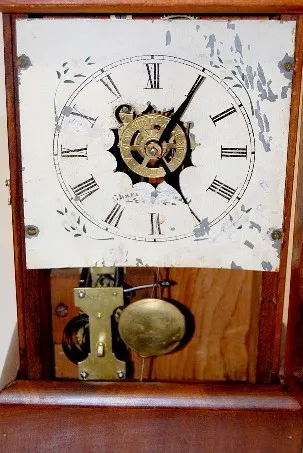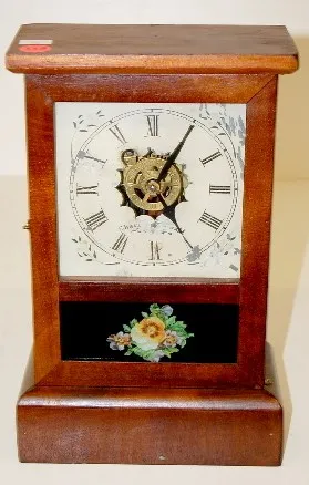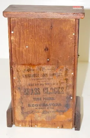 Waterbury Rosewood Cottage Clock w/Alarm: time only; metal painted dial with center alarm ring; offset winding key (by the 11); partial unreadable nam...