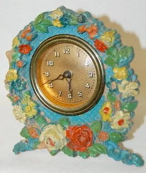 2 Floral Wreath Keywind Clocks: easel backs. 1.) Labeled Deluxe Clock Co. Louis XVI art clock. 2.) Labeled Polyroid The National Clock Co. (Not runnin...