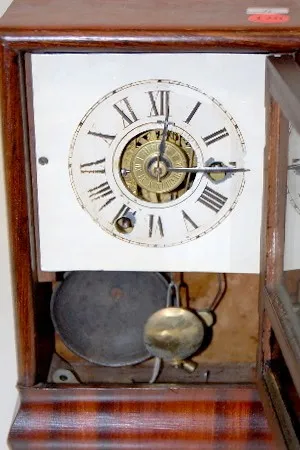 Seth Thomas Rosewood Cottage Clock w/Alarm: time and strike; painted metal dial with alarm center ring; offset winders at 3 and 7; interior paper labe...