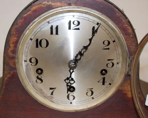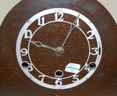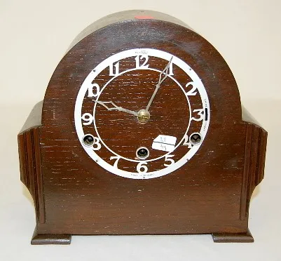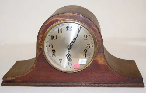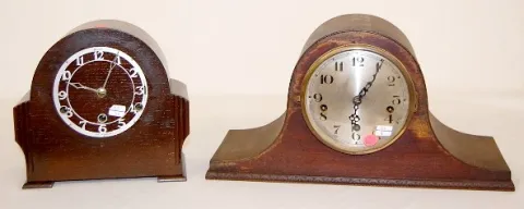 2 Westminster Chimes Mantle Clocks: 1.) Round top; 5 rod strike. (Missing 1 hammer; case roughness; some new nails.) 2.) English oak; 4 rod; no bezel....