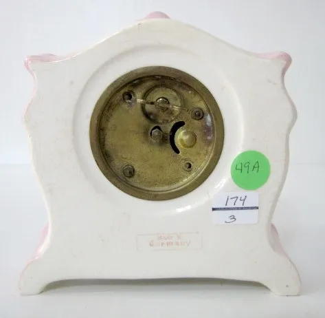 New Haven Miniature Floral China Clock: porcelain signed dial; case marked Made in Germany; thumb wind. Running at this time....