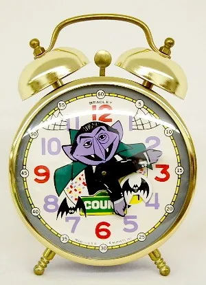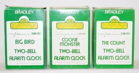 3 Bradley Sesame Street Alarm Clocks: Big Bird; Cookie Monster; The Count; in original boxes; not tested; 2 bell....