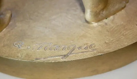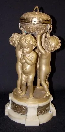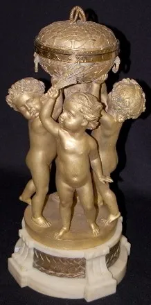 French Annular Bronze Cherub Statue Clock: 4 cherubs with 3 holding up the clock; movement signed Touricaste, Paris; bronze signed A. Marque and CIRE ...