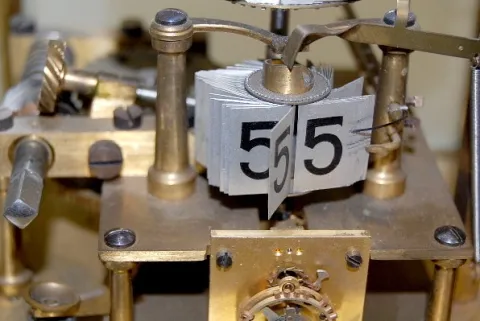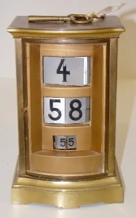 French Digital Crystal Regulator Clock: flip leaves for seconds, minutes and hours; has original key; beveled glass front door; other 3 sides are fros...