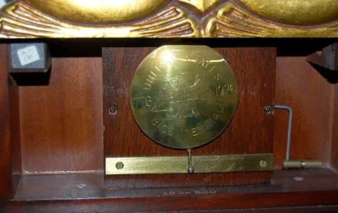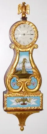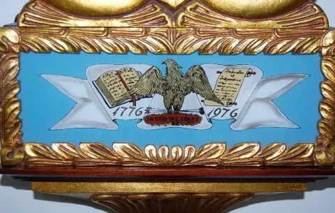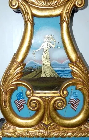Eurich and Romeo Weight Driven Lyre Banjo Clock: Dearborn, Mich, Bi-Centennial 1976; mahogany with gold leaf and reverse painted tablets; glass signed...