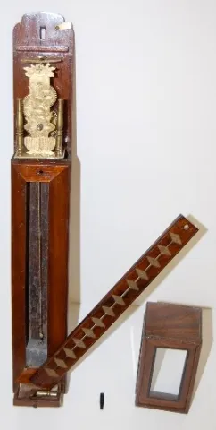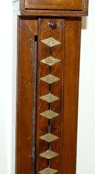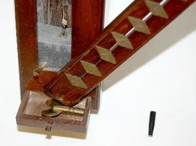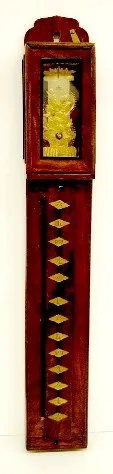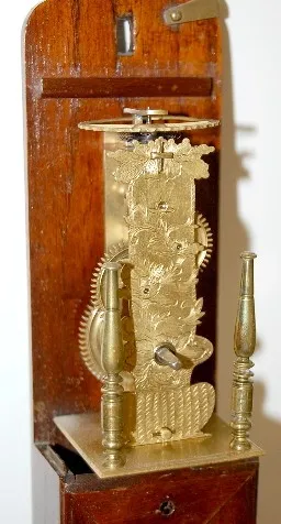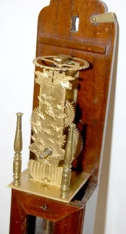 Dokei Japanese Weight Driven Stick Clock: engraved movement; brass numerals; removable hood; drawer with key. 15" x 2 1/2"...