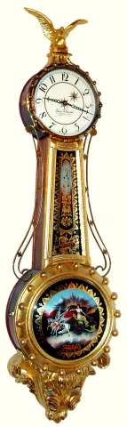Elmer O. Stennes, Weymouth, Mass., "Girandole" wall clock 8 day time only weight driven movement in gold leafed mahogany case stamped "OOB" for "Out on Bail" with convex reverse painted throat and lower Aurora tablets and painted metal dial, c1969