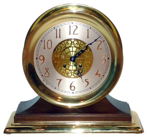 Chelsea Clock Co, Chelsea, Mass., "Limited Edition 2000 Millennium ship's bell mantel clock with 8 day spring driven time and ship's bell strike movement in polished brass case on walnut base with "Special Grand" silvered metal 8 1/2" dial with applied br