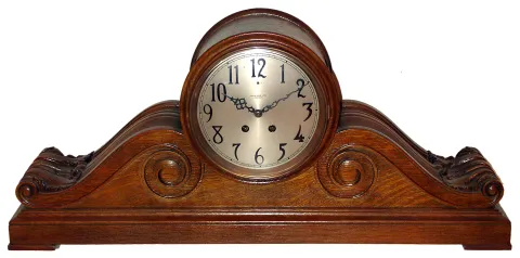 Seth Thomas Clock Co., Thomaston, Conn., manufactured for "Ryrie Bros. Ltd Toronto" oversize "Tambour" mantel clock 15 day time and gong strike spring driven movement in carved oak case with silvered metal dial with raised brass numerals, c1915