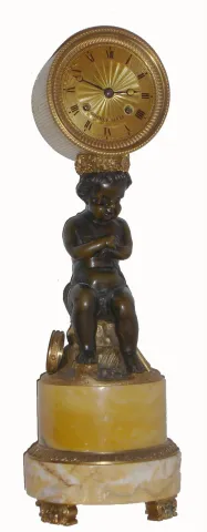 the well made movement has a highly refined pinwheel escapement, the 2 arms of the verge showing in the close up photo The cherub himself is very well...