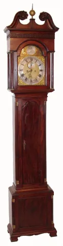 Benjamin Chandlee, Nottingham, (PA), a Chester County brass dial, bell strike movement, C.1770 associated with a central Delaware mahogany case with scalloped top door, reeded side columns w/ simple brass capitals, a broken arch hood and deeply carved ros