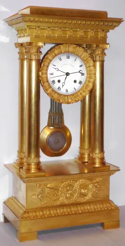 French, Gillet Ain A Clermont, Paris, four column Empire mantel clock in bright ormolu case with well made spring driven pinwheel movement and count wheel strike, c1860