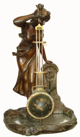 this clock comes to us as-found from storage, and the ball and movement are dirty. The case of a flower girl leaning over a fountain, retains original...