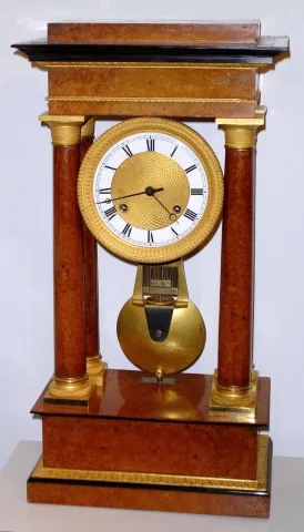 French, Rieussec (Paris), 8 or 30 day mantle regulator with heavy knife edge compensating pendulum and center seconds. Burled walnut veneer case, c1830