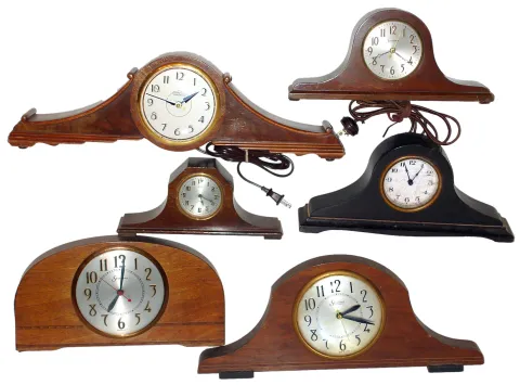 3 are Sessions plug in electrics with sweep seconds, largest 7" high, two Ingrahams also plug in (one not shown in photo). 2 smallest are 30 hour rear...