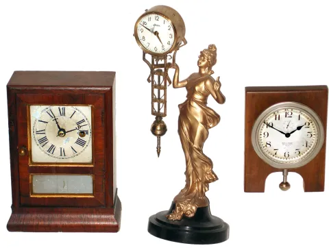 Three clocks: Seth Thomas 30-hour cottage timepiece; Waltham 8-day 1919 car clock; Linden Japanese swinger.