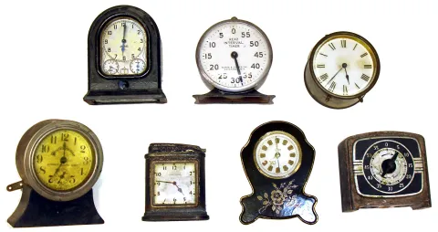 Seven small wind-up clocks and timers. Automatic range timer, Westinghouse automatic electric range, Swiss Thorens with "Auf Wiedersehen" music box, Sessions timer, Phinney Walker lighter, Rexo Interval Timer, and French brass drum clock with cylinder pla