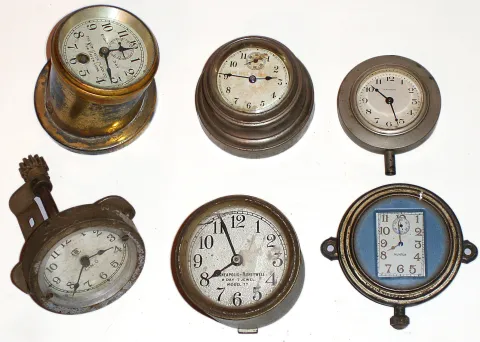 Six small mounted metal clocks: five auto clocks and one Minneapolis Honeywell 8 day 7 jewel Model 77 for early thermostat. Car clocks include an 8 day New Haven in angled case, Seth Thomas with dial faintly lettered for "The Will and Baumer Co. Church Ca