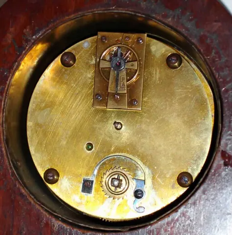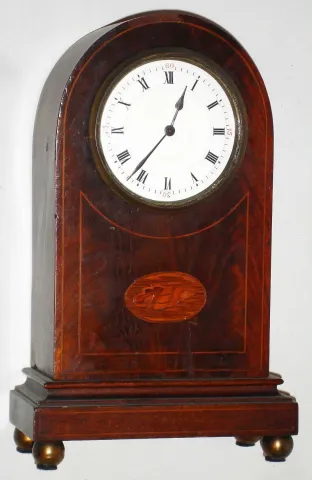 French inlaid mahogany 8 day time only spring driven shelf or desk clock, c1900