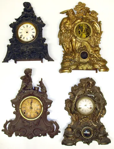 Four Connecticut 8-day figural iron fronts Detailed castings, one with drum playing rabbit. One by Ansonia Brass and Copper. Largest, by Welch and missing its dial, is 19" high.