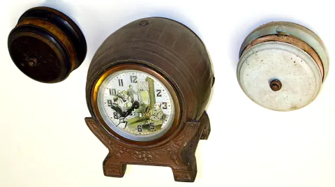 Three American 30 hour metal novelty clocks. Two are Lux "tape measure" horizontal dial. Largest and best is United Clock Co. beer keg with animated dial of bartender shaking cocktails, 9" tall.