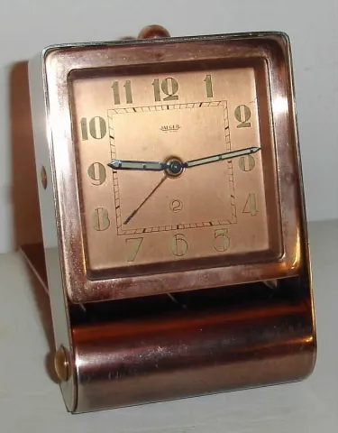 Jaeger Swiss Art Deco alarm travel clock in copper finish fold away case with Arabic numeral metal dial, c1925