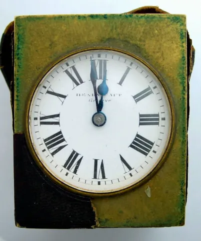 Henry Capt, Geneve Switzerland miniature carriage clock / travel clock key wind key set movement with platform lever escapement in leather covered brass rectangular case with Roman numeral white enamel dial, sNo. 291