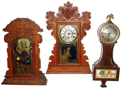 Banjo is a Sessions York mahogany time only, case has nice original glossy finish,26" high. Welch time and strike oak gingerbread has darkened rear la...
