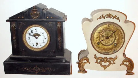 Two American visible escapement mantel clocks. One is Boston Clock Co. tandem wind in black marble case. Second is a Waterbury in white iron French style case. Each is approx. 12" high.
