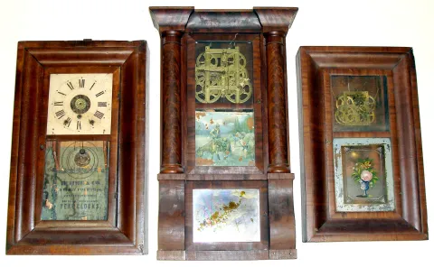 Three Connecticut weight driven shelf clocks, incomplete. Smallest is 30 hour Sperry and Shaw OG with pretty floral tablet but bare zinc dial plate. Middle is Duhme and Co., Cincinnati 8 day OG with built-in alarm, no glasses. Largest is Waterbury column