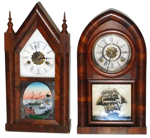 Steeple clock is a 30 hour Gilbert with alarm, nice old glasses, good label, faded metal dial, 20" high. Beehive is an 8 day Waterbury, with only slig...