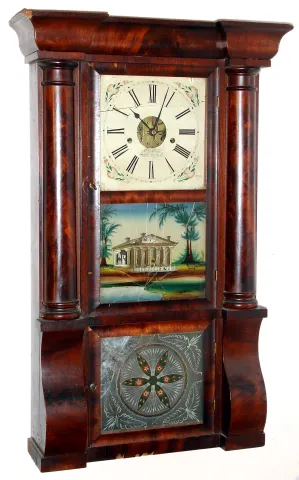 Forestville Mfg. Co., J. C. Brown shelf clock 8 day time and strike weight driven movement in column and cornice mahogany veneer case, c1850