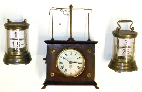 Three Horolovar reproduction German 30 hour novelty clocks. Two are modern versions of Plato flip card timepieces with 7 jewel bottom wind movements, 6" tall. Flying ball pendulum clock, with Jerome and Co. 1883 dial, is 10" tall.