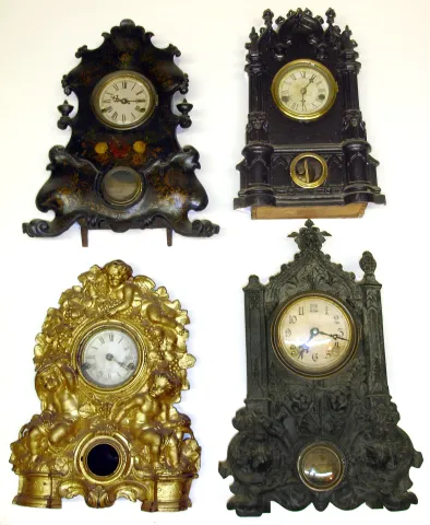 Four American iron fronts All with inside paper labels: Kutztown PA overpaste, American Clock Co., Crosby and Vosburgh and Nicholas Muller -- tallest at 19" high.