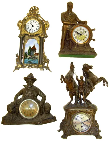 Four large cast-metal novelty clocks. Two are United Clock Co. -- FDR with animated arm on dial, other is Will Rogers. One has nice painted enamel front panel. Nicest with bronzed finish and rearing horses is 17" high.