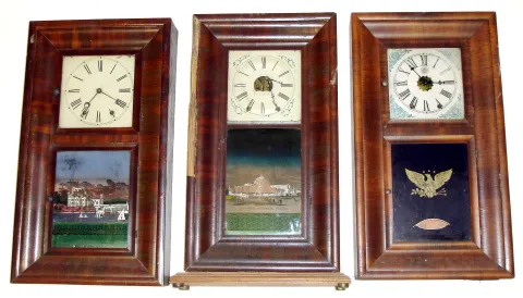 Three 8 day ogee Connecticut weight driven shelf clocks- the first is a Chauncey Goodrich dial, later added base, and old New York Crystal Palace tablet (and prior insect damage visible behind loose veneer strip), a Jerome and Co. 2 door with old English